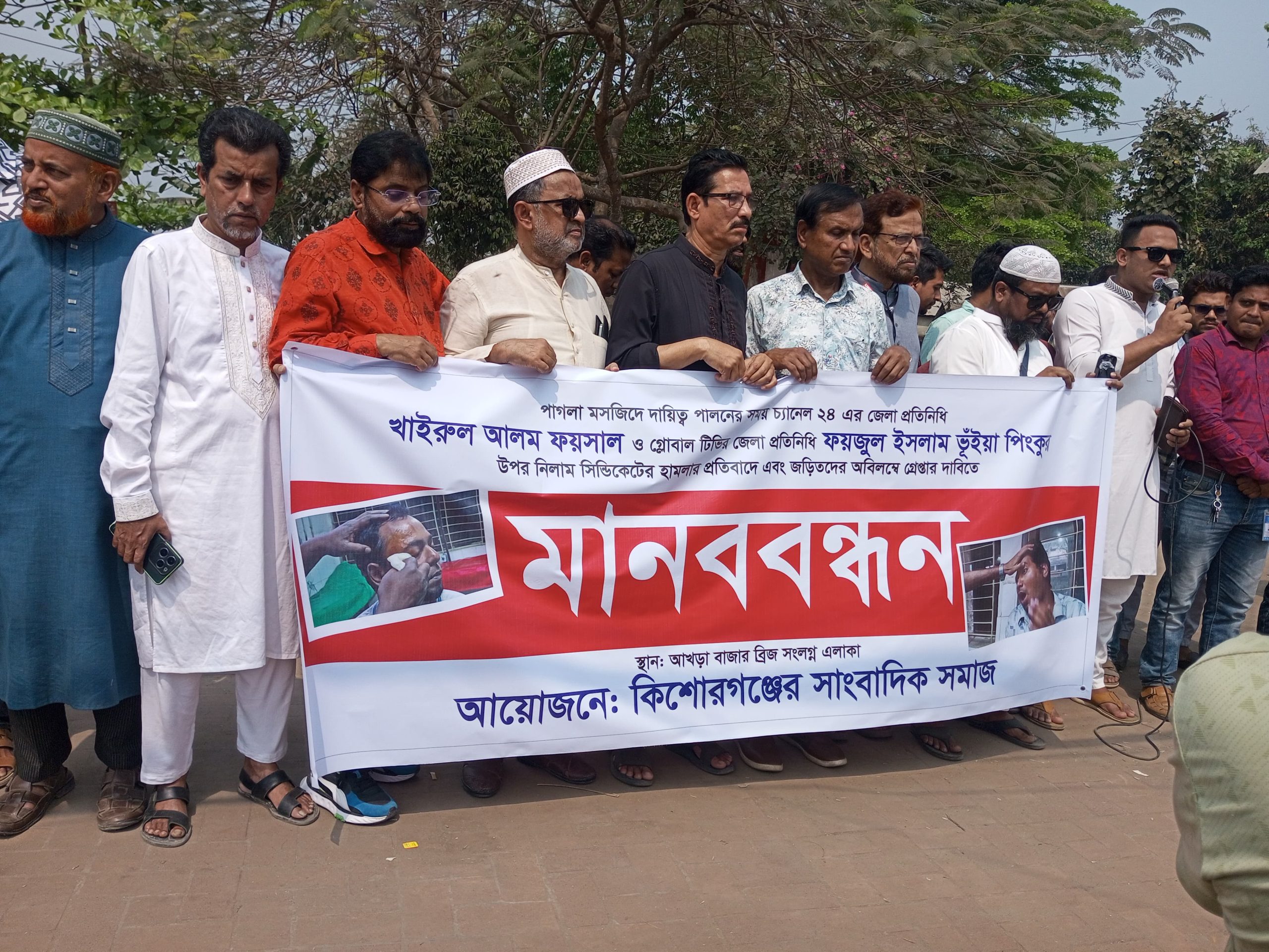 কিশোরগঞ্জের ঐতিহ্যবাহী পাগলা মসজিদের নিলাম ডাকের সংবাদ সংগ্রহ করতে গিয়ে দুই সাংবাদিকের ওপর হামলার প্রতিবাদে মানববন্ধন করেছে জেলার কর্মরত সাংবাদিকরা। একই সঙ্গে হামলাকারীদের দ্রুত গ্রেপ্তার ও দৃষ্টান্তমূলক শাস্তির দাবিতে ২৪ ঘণ্টার আল্টিমেটাম দেওয়া হয়েছে।