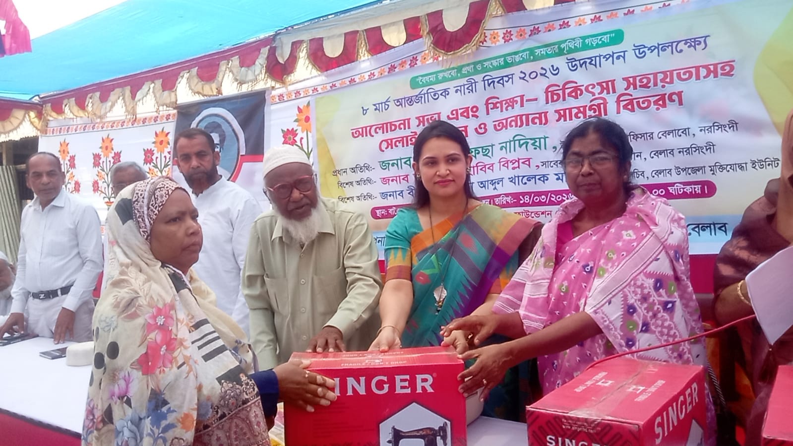 বৈষম্য রুখবো,প্রথা ও সংস্কার ভাঙ্গবো, সমতার পৃথিবী গড়বো এ প্রতিপাদ্যকে ধারন করে নরসিংদীর বেলাবোতে বাংলাদেশ মহিলা পরিষদ বেলাবো সাংগঠনিক জেলা শাখার ব্যবস্থাপনায় ৮ মার্চ আন্তর্জাতিক নারী দিবস ২০২৬ উদযাপন উপলক্ষ্যে বীর মুক্তিযোদ্ধা শহীদ নজিব উদ্দিন খাঁন ফাউন্ডেশনের অর্থায়নে উপজেলার বিভিন্ন ইউনিয়নের দারিদ্রদের মাঝে শিক্ষা-চিকিৎসা সহায়তা ও সেলাই মেশিণ বিতরন করা হয়েছে। ১৪ মার্চ শনিবার উপজেলার বারৈচা সরকারী প্রাথমিক বিদ্যালয় মাঠে উক্ত আলোচনা সভা ও শিক্ষা-সহায়তা প্রদান করা হয়। মহিলা পরিষদ বেলাব উপজেলা সাংগঠনিক জেলা শাখার সভাপতি রাবেয়া খাতুন শান্তির সভাপতিত্বে এবং সংগঠনেন সাংগঠনিক সম্পাদক খালেদা শারমিনের সঞ্চালনায় প্রধান অতিথি হিসেবে উপস্থিত ছিলেন বেলাবো উপজেলার নির্বাহী কর্মকর্তা উম্মে হাফসা নাদিয়া,বিশেষ অতিথি হিসেবে উপস্থিত ছিলেন বেলাবো উপজেলা মুক্তিযোদ্ধা ইউনিট কমান্ডের সদস্য সচিব বীরমুক্তিযোদ্ধা আব্দুল খালেক মাষ্টার,নারায়ণপুর ইউনিয়ন বিএনপির সভাপতি মোঃ রশিদুল ইসলাম লাল,সংগঠনের সাধারন সম্পাদক নাজরীন হক হেনা,সহ সাধারন সম্পাদক আসপিয়া আক্তার হেনা সহ স্থানীয় ব্যক্তিবর্গ।এ সময় ১৩ লক্ষ ৫০ হাজার টাকার মাঝে। ৩৫০ জন দারিদ্র নারী পুরুষের মাঝে শিক্ষা- চিকিৎসা সহায়তা, ঘর মেরামত সহ ১০০টি সেলাইমেশিন বিতরণ করেন।
