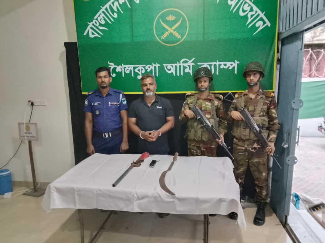 ঝিনাইদহের শৈলকূপায় সেনাবাহিনীর বিশেষ অভিযানে দেশী-বিদেশী অস্ত্রসহ অবসরপ্রাপ্ত সেনা সদস্য পলাশ মিয়া নামে এক ব্যক্তিকে গ্রেফতার করেছে। সোমবার শৈলকুপার সারুটিয়া ইউনিয়নের কৃত্তিনগর গ্রাম থেকে তাকে গ্রেফতার করা হয়। পলাশ ওই গ্রামের জিয়ারত আলীর ছেলে। এসময় তার কাছ থেকে একনলা রাইফেল, শক দেওয়া মেশিন ও রামদা উদ্ধার করা হয়েছে।