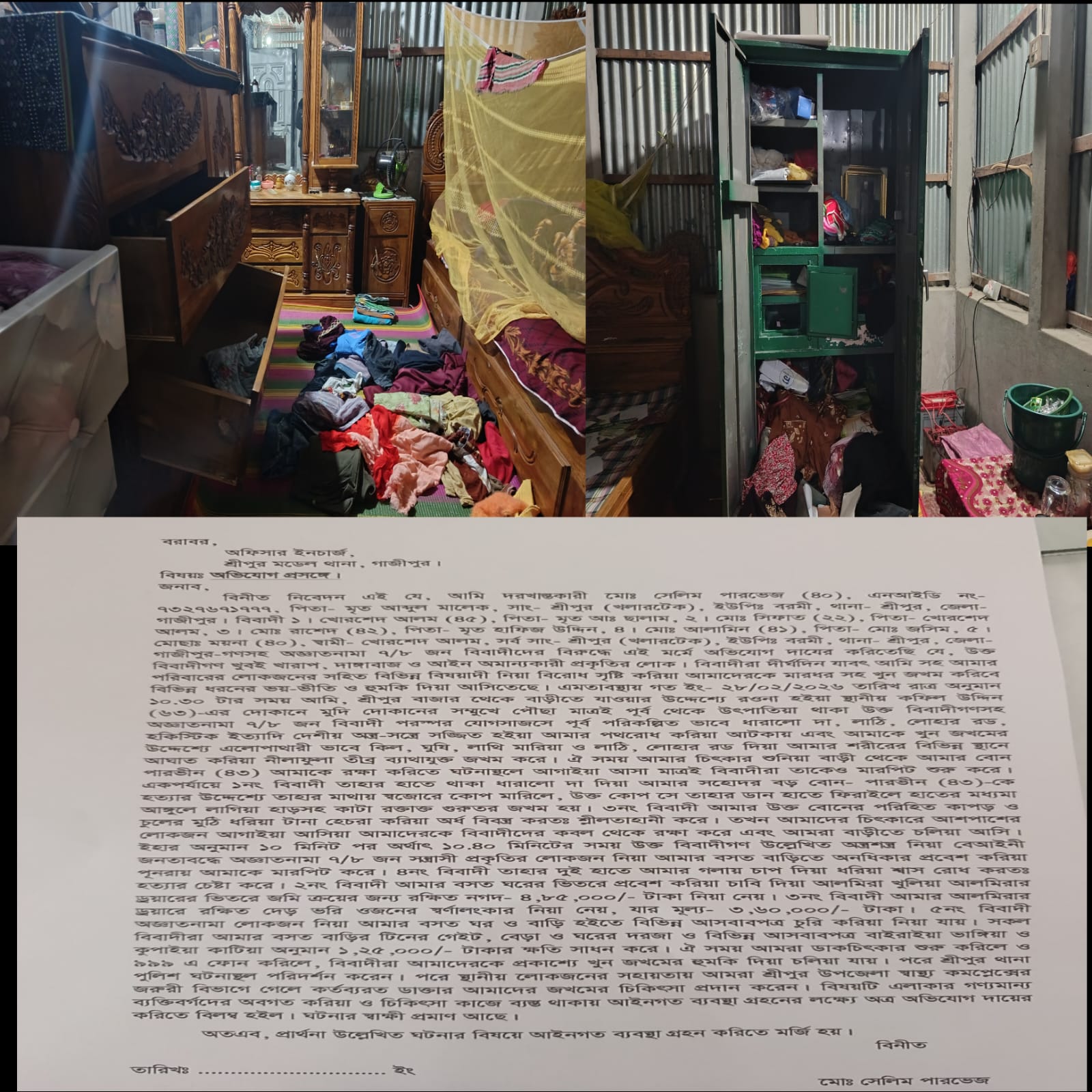 ভুক্তভোগী সেলিম পারভেজ জানান, “বিবাদীরা অত্যন্ত দাঙ্গাবাজ প্রকৃতির। তারা দীর্ঘদিন ধরে আমাদের খুনের হুমকি দিয়ে আসছিল। গতকাল তারা পরিকল্পিতভাবে আমাদের ওপর হামলা চালিয়ে টাকা ও স্বর্ণ লুটে নিয়েছে।”
